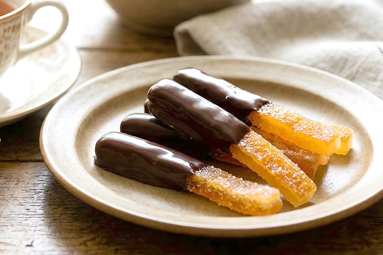 皮を数回茹でこぼして苦味を抜き、砂糖で煮詰めて乾燥させます。仕上げにチョコレートをコーティングすれば、高級感のある「紅甘夏オランジェット」に。紅甘夏の爽やかな香りと共にティータイムをお楽しみください♪